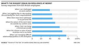 In the article, they referenced the survey, which asks the question, “what’s the biggest drain on resilience at work?” I’m going to discuss the top three here today. To start off with a staggering 75% of respondents indicate that managing difficult relationships and politics in the workplace drains their resilience reserves. 70% state volume or pace of work, stretches them to the limit.
