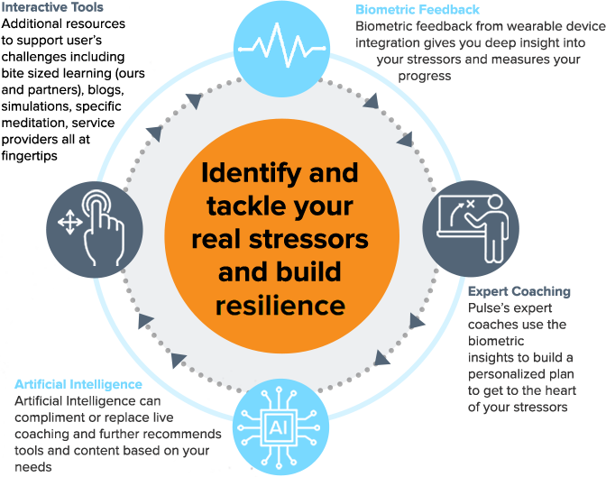 Using aggregate data, Pulse can show executives how resilient or stressed your company is, and we can measure it. The Pulse app will give your organization a resilience score, made up of the individual data within your organization. You can track the health of your company and its stress, and build keen insight into your culture, employee engagement, and employee turnover.