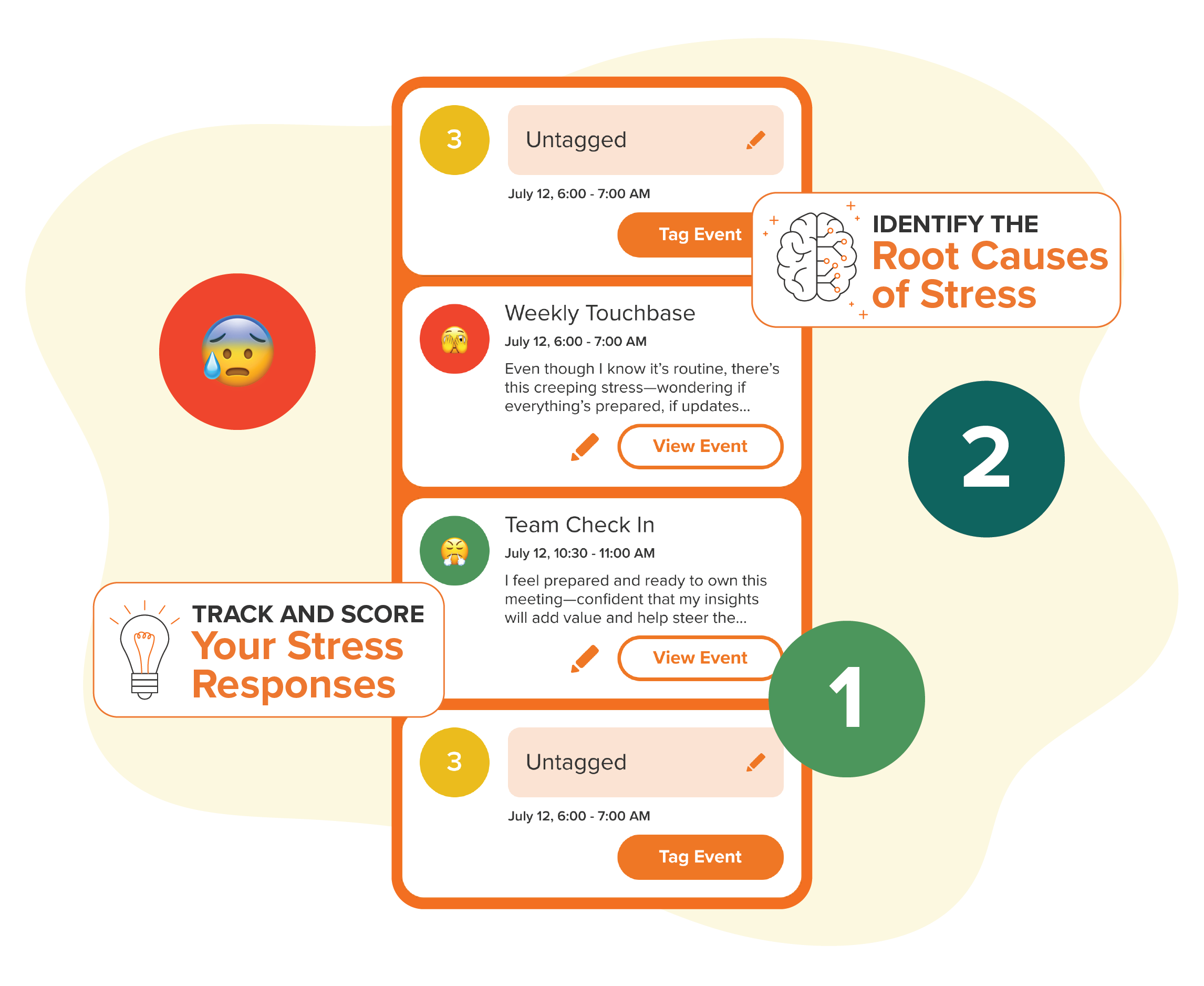 1. Track and Tag: Your HRV data shows how stressed you are throughout the day. Tag the moments that are most stressful (level 3 and 4 events) for deeper analysis.